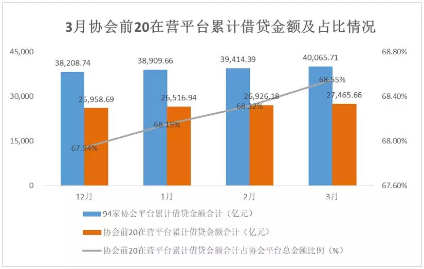这20家在营平台累计借贷金额合计数占全部94家协会会员平台的68.55%,该比例连续三个月保持在68%以上,并在2019年稳步增长。