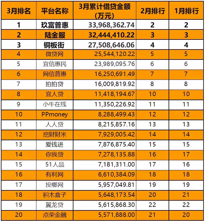 截至3月,玖富普惠为网贷行业中累计借贷金额最高的在营平台,其累计借贷金额为3396.84亿元;陆金服的累计借贷金额为3244.44亿元。