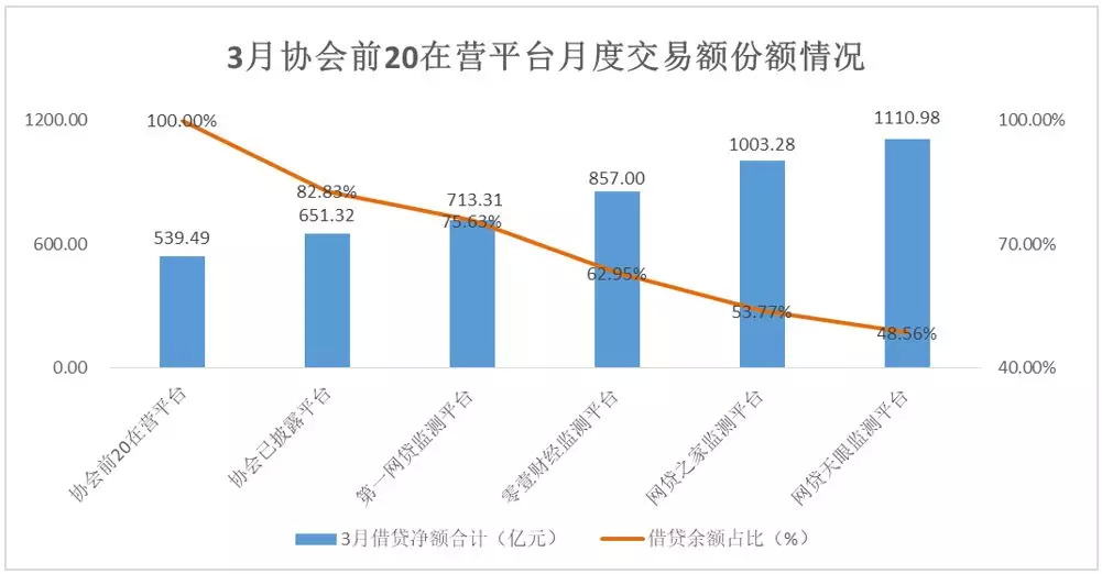 与网贷行业整体相比,累计借贷金额最高的20家在营平台的月度交易规模同样占行业主导地位。3月,中国互金协会、第一网贷、零壹财经、网贷之家和网贷天眼监测的行业月度交易规模分别为651.32亿元、713.31亿元、857亿元、1003.28亿元和1110.98亿元。