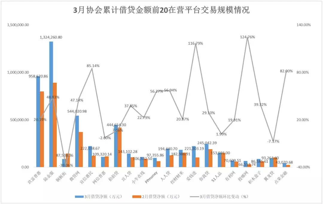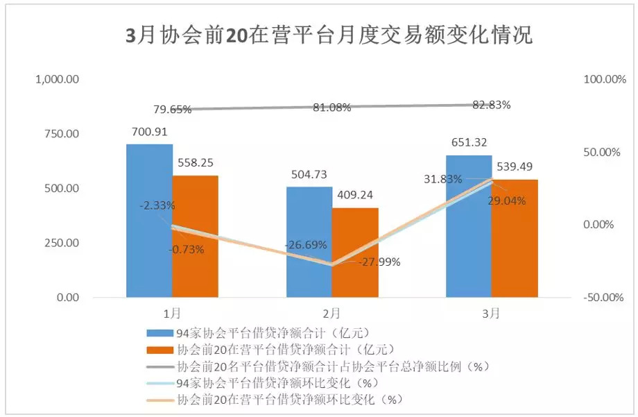 协会累计借贷金额最高的20家在营平台3月借贷净额(月度交易规模净值)合计为539.49亿元,较2月增长31.83%。2月,这20家平台的交易规模较1月仅下降26.69%。