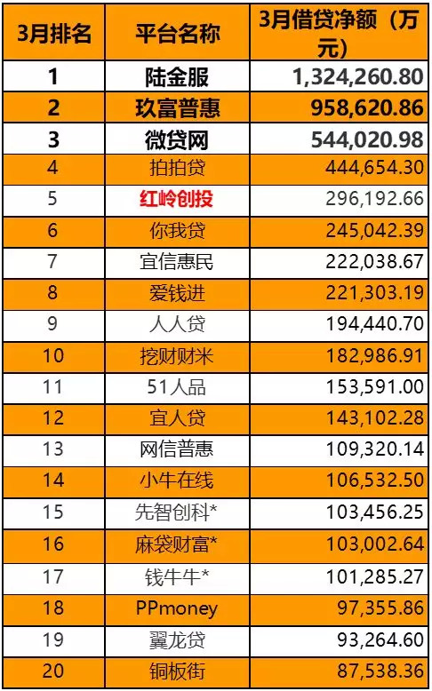 3月,协会中月度交易规模前20的平台中有16家也是累计借贷金额前20的在营平台。其余4家分别是先智创科、麻袋财富、钱牛牛和宣布良性退出的红岭创投。