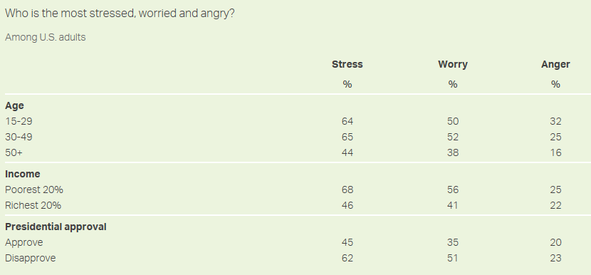 同时,受访者的收入情况与焦虑和压力相关。在美国,最贫穷的20%人口中有近70%的人表示他们在前一天经历了压力,而在最富有的20%的美国人中,这一比例为48%。同样,56%的贫困群体表示他们(对生活)担心。而在富有群体中,这一比例为41%。