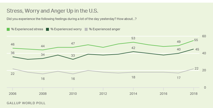 但对美国人民来说,过去的一年对他们的心理形成了很大挑战。盖洛普调查显示,在2018年有55%的美国人表示,他们在一天中的大部分时间里感到压力,45%的美国人表示担心,22%的美国人表示愤怒。从时间曲线来看,这三项主要负面情绪在2017年左右开始上升,到2018年中期分别上升了5个百分点,大于2008年金融危机期间负面情绪的上升幅度。