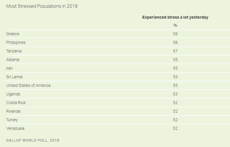 事实上,美国受访者的压力指数在143个国家和地区中排名第7,高于卢旺达和委内瑞拉。2018年也是美国受访者更加愤怒的一年,但总体来说这个比例(22%)远远低于巴勒斯坦(43%)、伊朗(43%)和伊拉克(44%)等国的受访者。