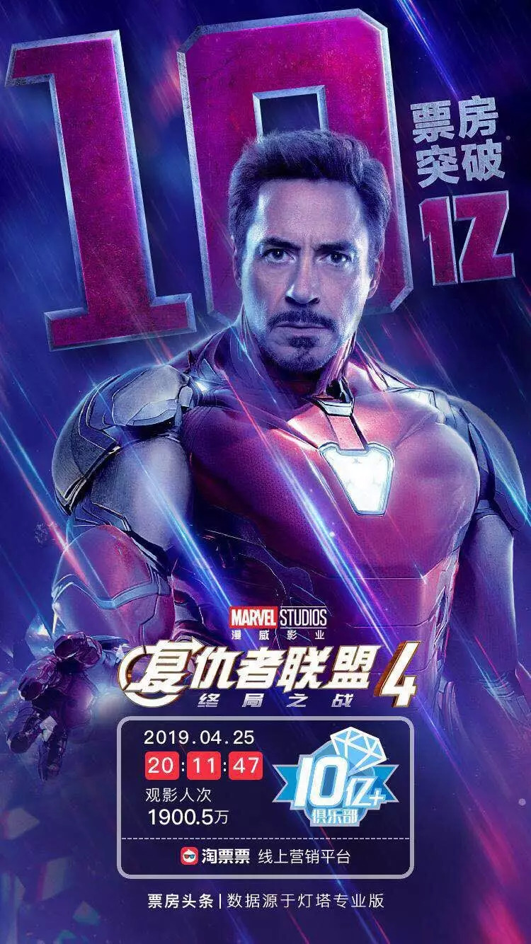 《复仇者联盟4》上映,影迷狂欢。据灯塔专业版票房数据显示,4月25日晚,《复联4》上映44小时11分后,票房破10亿,打破中国影视最快破10亿纪录。