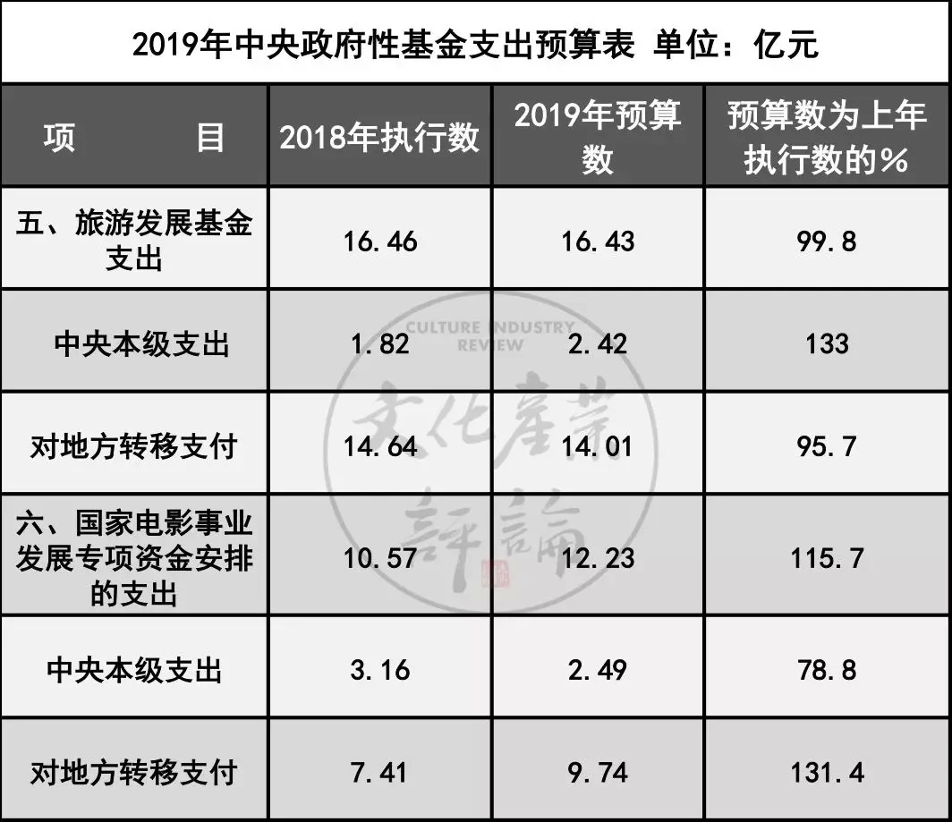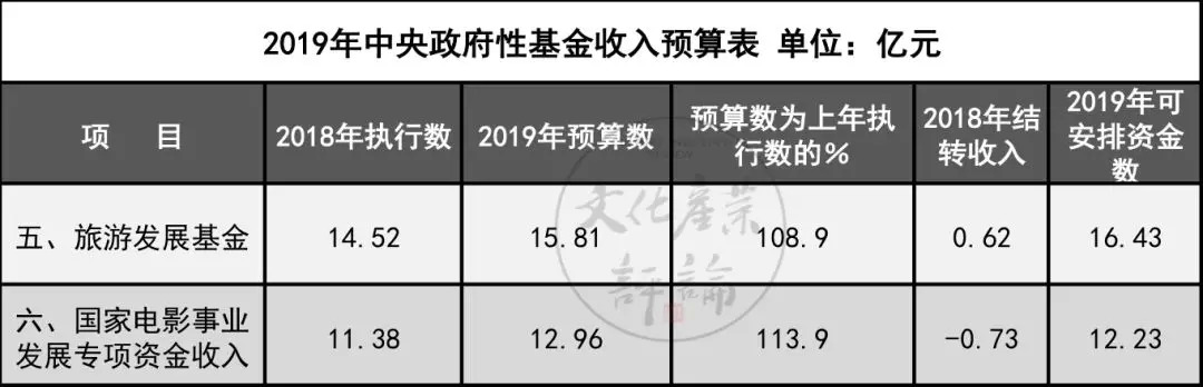 如,2019年旅游发展基金和国家电影事业发展专项资金收入和支出预算就是中央政府性基金模式具体体现(表五、表六)。根据《国家电影事业发展专项资金管理办法》,观众在城市电影院每买一张电影票,电影院就要向广电部门上交电影票收入的5%作为电影发展专项资金,用以发展国产电影等专门事业。