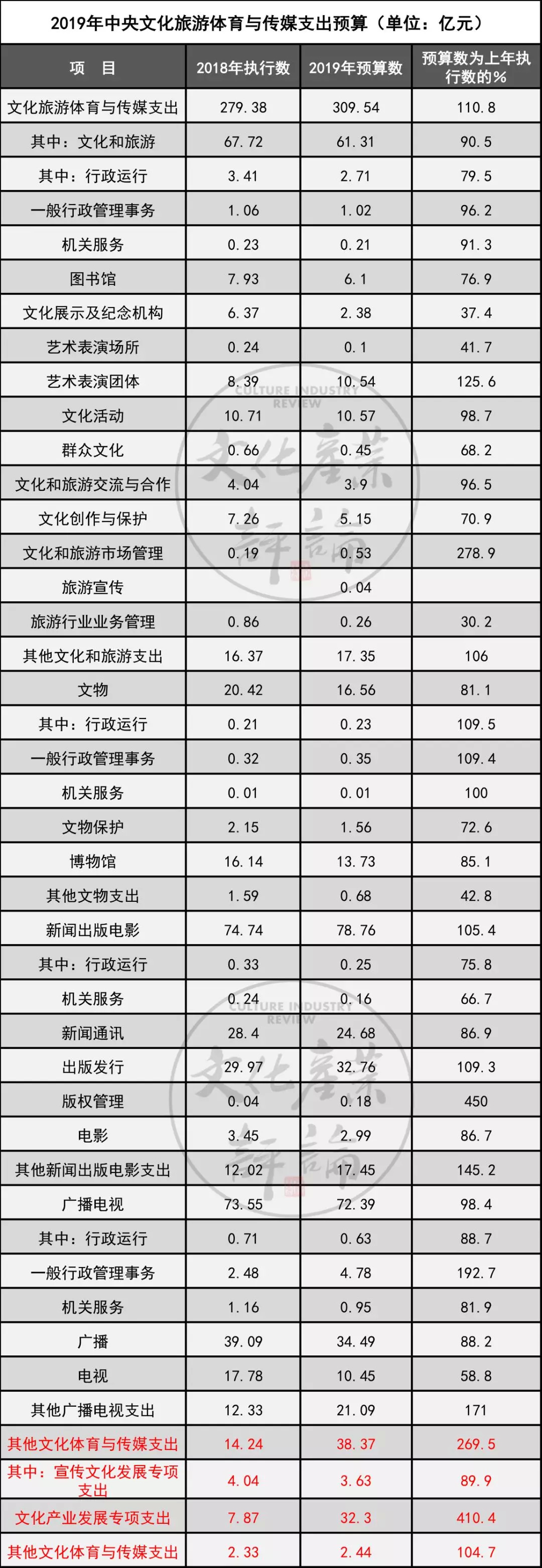 由上图(表三)标红处可以看到,2019年中央文化旅游体育与传媒支出预算中,其他文化体育与传媒支出预算数为38.37亿元,比2018年执行数增加24.13亿元,增长169.5%。其中,文化产业发展专项支出预算为32.30亿元,比2018年执行数增加24.43亿元,增长310.4%。主要是项目实施主体发生变化,部分资金由对地方专项转移支付转列中央本级。也就是说,2019年文化产业专项资金有32.30亿元由中央财政直接对项目实施主体进行专项支付。
