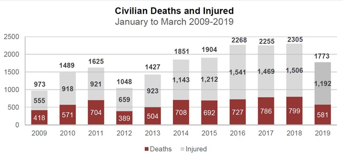 这一数字与去年同期相比下降了23%,也是自2013年以来的同期最低。但亲政府武装执行的空袭和搜索行动共造成608名平民伤亡,其中有305人死亡、303人受伤,比去年同期上涨39%。