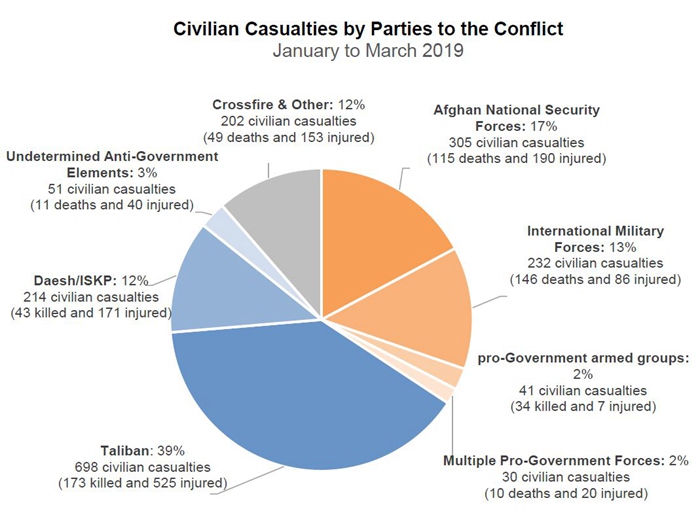 反政府武装共造成963名平民伤亡,其中227人死亡。在各方造成的平民伤亡总数中,39%由塔利班负责,17%为阿富汗国家安全部队,13%为国际军队,12%为“伊斯兰国”(ISIS)。