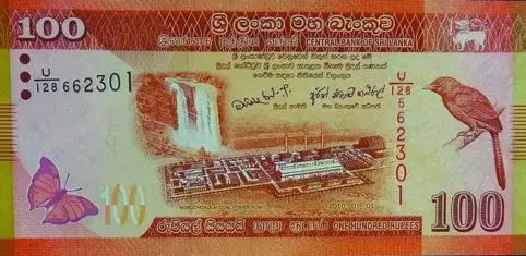 斯里兰卡100卢比(约合人民币3.85元),印刷着中国机械设备工程股份有限公司承建的普特拉姆煤电站——斯里兰卡全国第一个燃煤电站、斯里兰卡建国以来最大的工程建设项目和中斯两国迄今为止最大的经贸合作项目。
