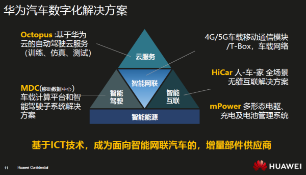 对于“增量部件”的定义,徐直军在将其称之为“华为汽车数字化解决方案”,主要分为五大部分:基于华为云的自动驾驶(训练、仿真、测试)云服务Octopus;4G/5G车载移动通信模块和T-BOX及车载网络;基于MDC(移动数据中心)的车载计算平台和智能驾驶子系统解决方案;人-车-家全场景无缝互联解决方案HUAWEI HiCar;多形态电驱、充电及电池管理系统mPower。