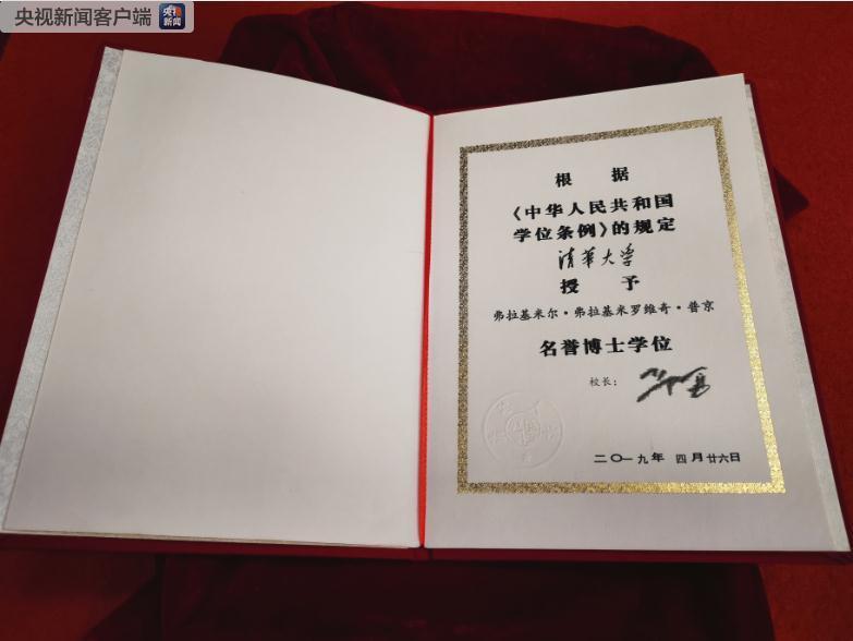 在习近平主席见证下,清华大学校长邱勇向普京总统颁发了名誉博士证书。普京在接受证书时说:清华大学是举世闻名的大学,也是习近平主席的母校,培养了很多优秀人才。今天,在我的好朋友习近平主席见证下,清华大学向我授予名誉博士学位并举行隆重仪式,我感到很荣幸,也深受感动。