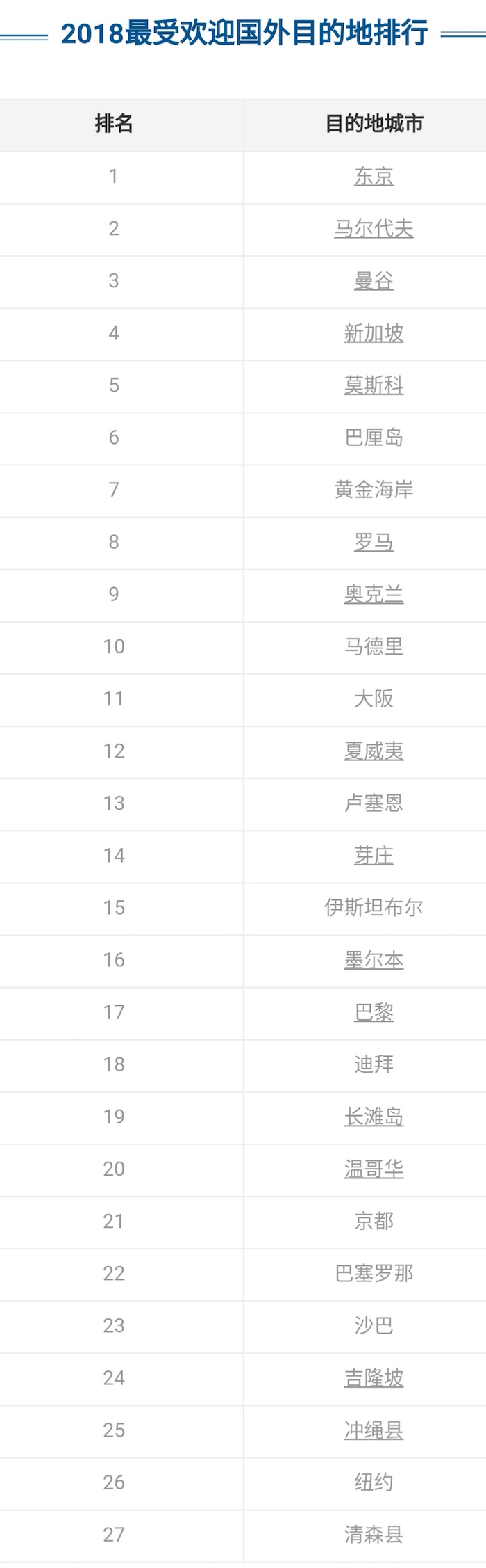 东京成为2018年境外最受欢迎目的地,紧随其后的是马尔代夫、曼谷、新加坡、莫斯科、巴厘岛、黄金海岸、罗马、奥克兰和马德里。日本及东南亚地区国家仍是热门旅行地,而罗马、奥克兰和马德里的上榜则体现出了国人旅游的“人文化”趋势。