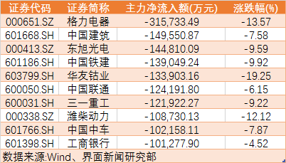 在本周主力资金持续净流出个股中,共计302只个股累计主力资金净流出额超过1亿元,较上周增加177只。这其中,格力电器(000651.SZ)、中国建筑(601668.SH)、东旭光电(000413.SZ)等个股本周遭主力抛售幅度最大,其累计净流出额分别为31.57亿元、14.96亿元、14.48亿元。