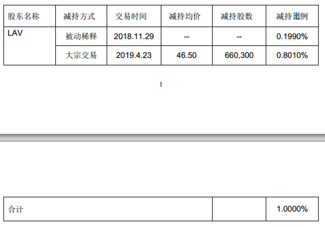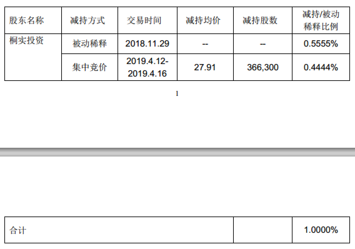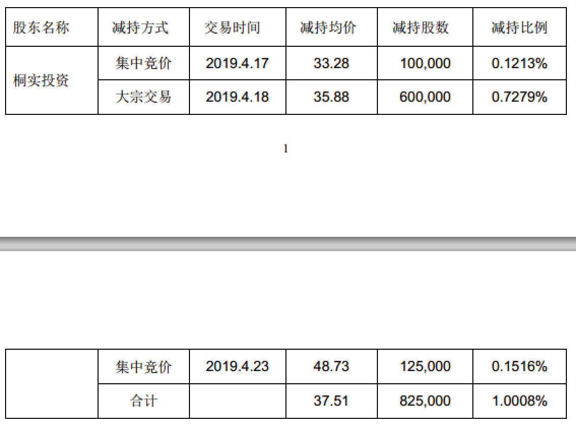 再往前推,在2月22日持股5%以上股东桐实投资有限公司(下称桐实投资)也表示过,自2019年2月22日起3个交易日后6个月内以大宗交易、集中竞价方式减持股份合计不超过494.58万股,即不超过公司总股本的6%。资料显示,桐实投资也是在近期出手大量减持,减持时间分别在4月12日-18日、23日。