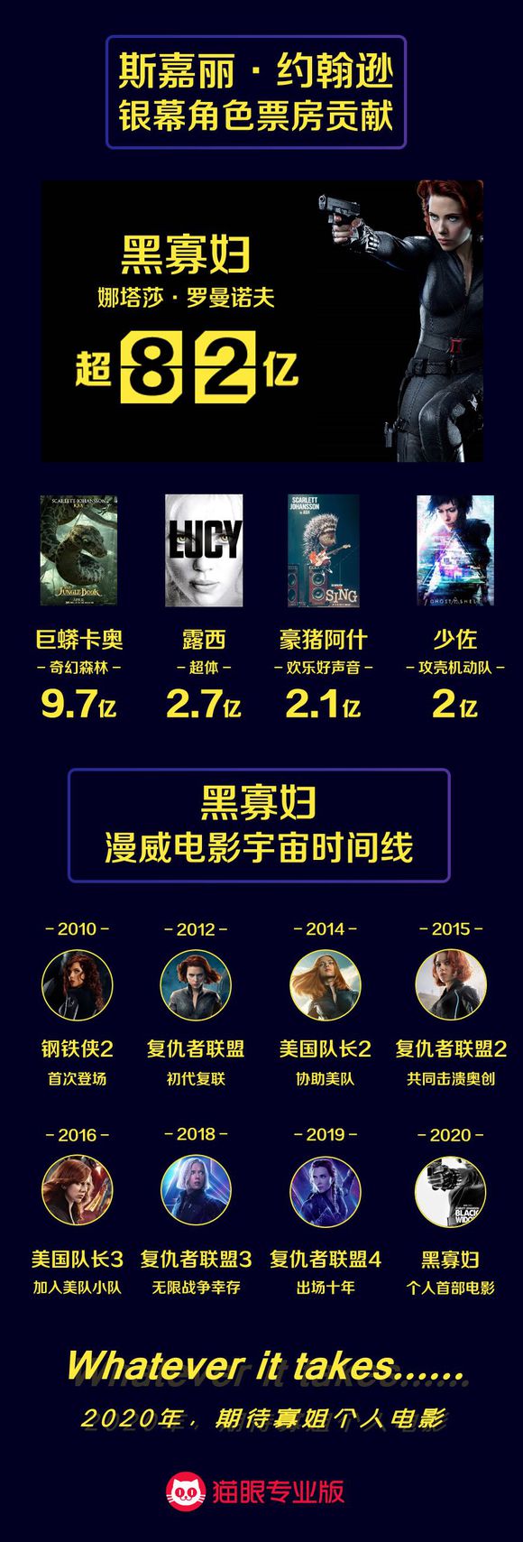 随着《复联4》在中国内地热映,据猫眼数据,“寡姐”斯嘉丽·约翰逊主演电影的中国内地票房总和已过100亿元,成为中国电影市场首个“百亿”女演员、首个外籍“百亿”演员。其中,漫威系列电影目前贡献了82.8亿,包括《钢铁侠2》《美国队长2》《美国队长3》以及《复仇者联盟》系列,《奇幻森林》9.7亿,《超体》2.7亿,《欢乐好声音》2.1亿,《攻壳机动队》2亿,《犬之岛》0.45亿。