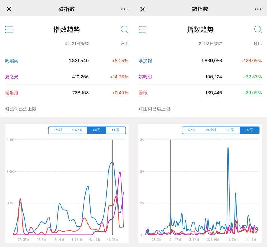 此外,通过对节目头部学员的人气分析,亦能看出学员在市场的接受度。数据显示,在节目仅播出了三期的情况下,周震南微博超话个人阅读量90.9亿、晨艺7062.7万、张颜齐9502.4万、何洛洛3.3亿、翟潇闻1.2亿。而在同类型节目中已成团出道的热门选手中,李汶翰微博超话个人阅读量16.3亿、管栎 8.3亿、李振宁 6.5亿;同时,第三期播出后,微博指数峰值显示《创造营2019》学员除周震南与李汶翰指数相当之外,其他热门学员亦明显居于上位。