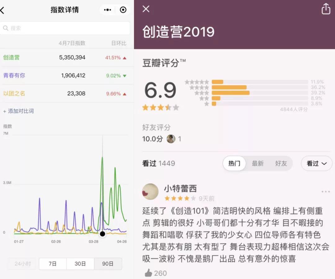 从百度指数来看,播出至第三期时,《创造营2019》节目搜索指数最高值已经突破50万,《青春有你》和《以团之名》的最高搜索指数分别为48.8万和44.9万;而在知乎话题页面,《创造营2019》3742人评价、2044人关注、推荐率为61%;豆瓣方面,豆瓣小组《创造营2019》组创始人为58640人,《青春有你》制作人为40800人,《以团之名》团妹有17949人。从各方数据对比来看,仅播出三期的《创造营2019》,便已实现对同类型节目整季的超越。