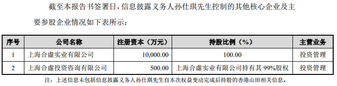 这里需要着重提及的是孙仕琪。据悉,该人士100%控制着上海合虚实业有限公司(下称合虚实业),从事法律相关业务多年,较少参与企业日常经营和管理,并非谋求上市公司控制权。在2019年3月19日,孙仕琪还出具过一份《关于不谋求上市公司实际控制人地位的承诺函》,承诺自本次表决权委托生效期限内,不谋求上市公司的控制权,并于同日出具了《关于不减持香港山田股份的承诺》,承诺自承诺函签署之日起一年内不减持其持有的香港山田股份。