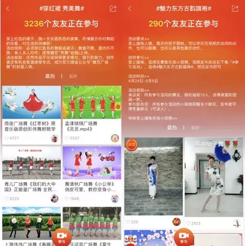 同时,围绕着广场舞教学,糖豆首页还开发了活动、娱乐、福利三大板块。点开“活动”,页面显示了如#我带家乡上糖豆#、#魅力东方古韵旗袍#、#雨夜《等着我来爱》新舞发布会#等可参与活动,其中热门活动的参与人数达三千余人;“娱乐”类似短视频集锦,视频时长在数分钟不等,内容涵盖了搞笑段子、民生新闻、烹饪、健康养生、技能教学等;“福利”则是电商板块,糖豆精选了日用百货、广场舞道具、粮油水果等第三方商品,点开商品后,可直接跳转至淘宝购买。