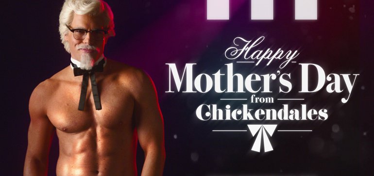 最近肯德基在美国发布了最新的母亲节活动,从4月29日起,购买一定数量的炸鸡都能获赠四块免费的肉桂甜饼。不过这并不是母亲节活动最精彩的部分——品牌还发布了一条广告,在广告中,桑德斯上校变成一位脱衣舞男,带着一群肌肉男跳起了脱衣舞,最后更是脱到只剩内裤,大秀美式翘臀。