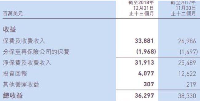 3月15日和4月11日,友邦保险在港交所发布年度业绩报告,《华夏时报》记者注意到,从2017年11月-2018年12月累计13个财务月里,受累于投资收益骤降,其2018年实现净利润仅为32亿美元,同比下降48%。而根据国际财务报告准则营运溢利投资回报中,友邦保险2018年纯利为31.63亿美元,2017年同期为61.20亿美元,减少49%。对此友邦保险在财报中表示,该减少是由于截至2018年12月31日止13个月的股权及房地产的负面短期波动为19.08亿美元,对比截至2017年11月30日止12个月的正面变动为17.41亿美元。