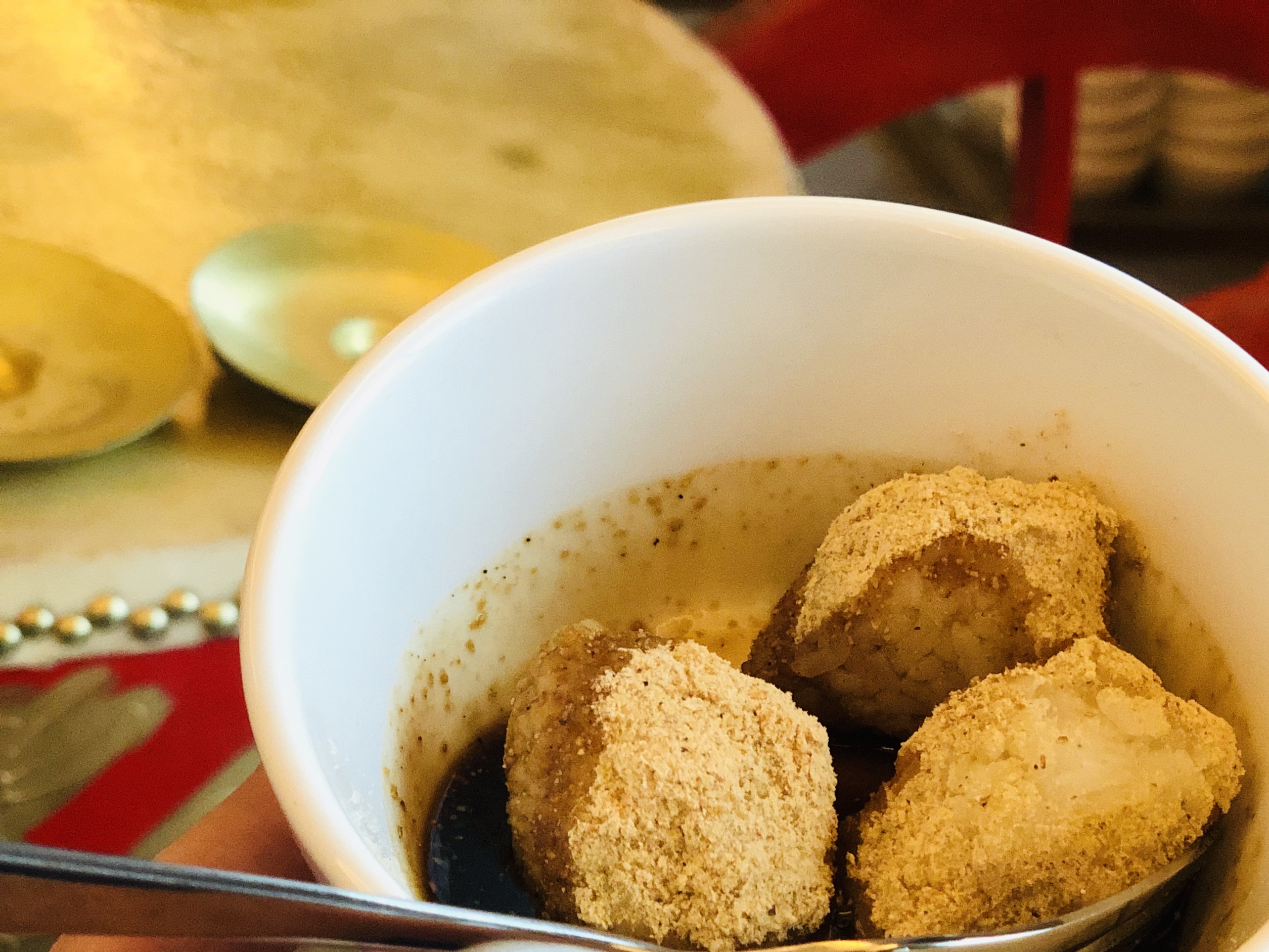 配上一份成都老师傅手制的“三大炮”,就是把用糯米制成的米球丢进花生粉中打个滚,咚咚咚三声,一份调皮又清甜的小甜品就端在手中。