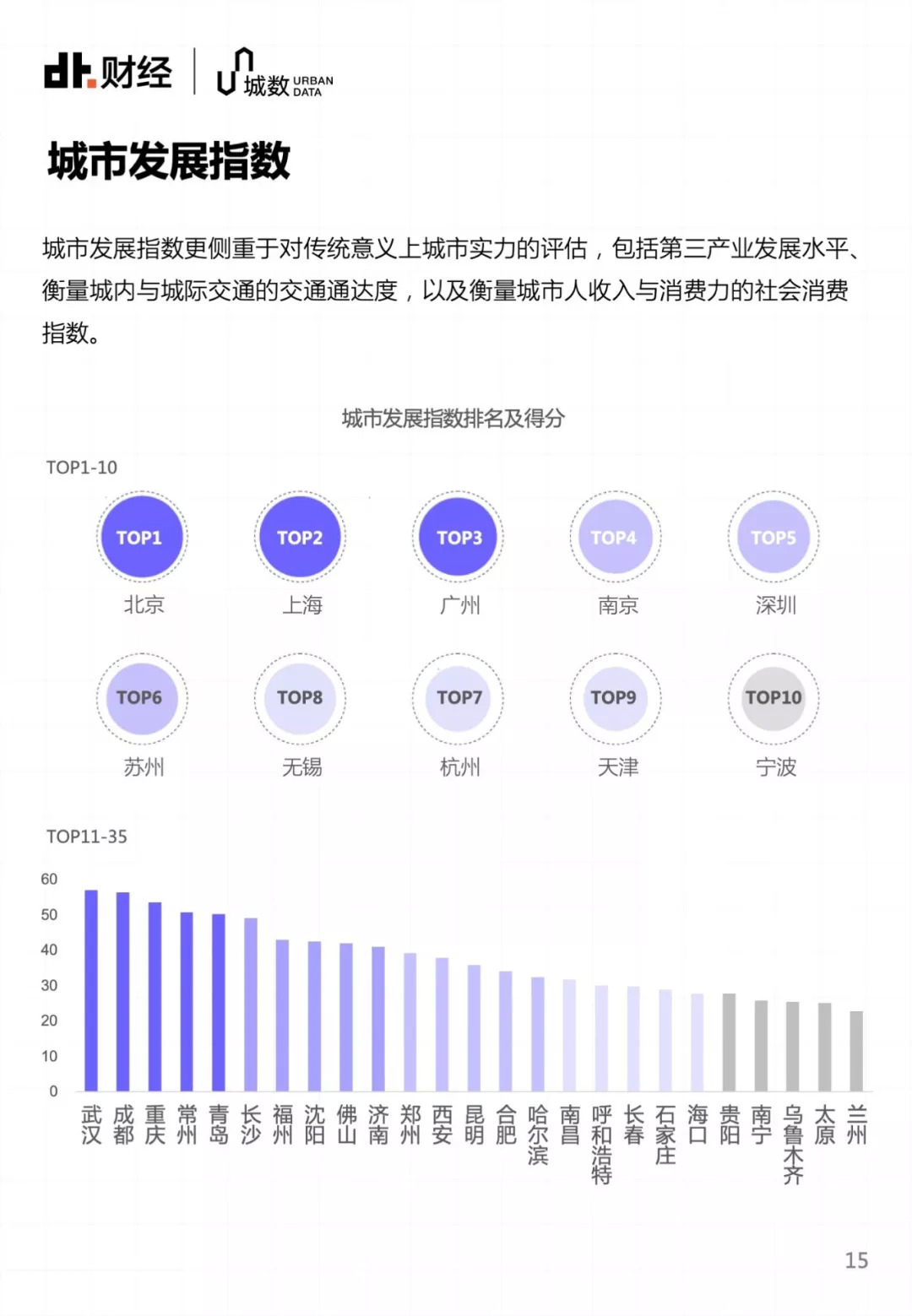 报告中的城市发展指数则更侧重于对传统意义上城市实力的评估,更长远来说,好看的经济指标表现与创新产业发展之间存在正向反馈的关系。城市发展指数包括第三产业发展水平、衡量城内与城际交通的交通通达度、衡量城市人收入与消费力的人均可支配收入和线上人均消费。