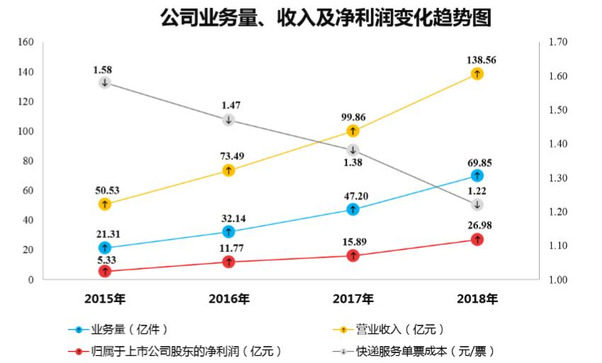 在快递服务收入快速增长及持续的成本管控作用下,韵达2018年的利润总额为35.50亿元,同比增长65.46%;实现归属于上市公司股东的净利润26.98亿元,同比增长69.76%,其中实现归属于上市公司股东的扣除非经常性损益净利润21.35亿元,同比增长38.66%。