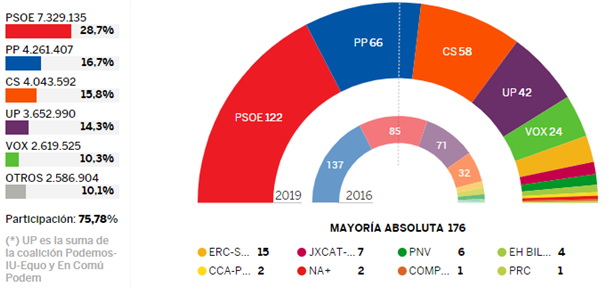 随着民声党此次成功进入议会,西班牙政坛的决定性力量也从持续三十年的两大党变成了五党纷争——更何况西班牙还存在着加泰罗尼亚共和左翼(ERC)、巴斯克民族主义党、加纳利联盟等众多不稳定的小党派。