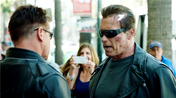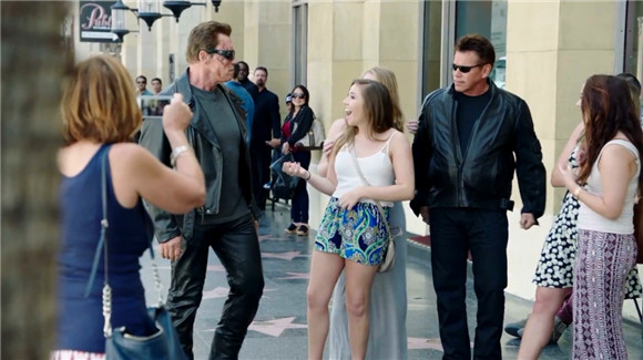 在蜡像馆还玩不够,施瓦辛格还要走到星光大道上去晃悠。