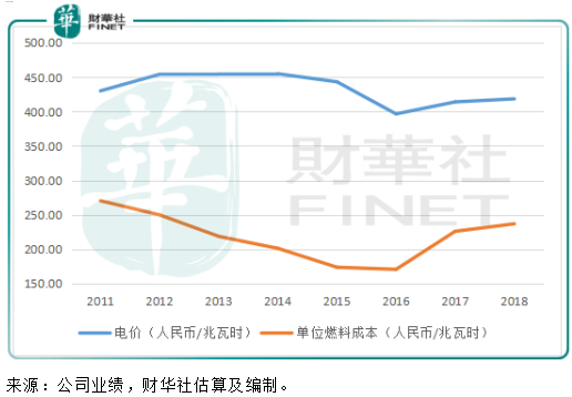 根据煤电联动机制,在煤价上涨的时候,煤电企业在商议长协价格的时候可适当提高电价,然而这存在一定的时间滞后,所以电价未必能及时跟上煤价的变化,参看下图的电价与单位燃料成本走势图,电价稍稍延后于燃料成本的上涨,在两者差距最大的2015年,该公司的毛利率达到29%的高位水平,但随后差距逐渐收窄,或反映联动机制在起作用。