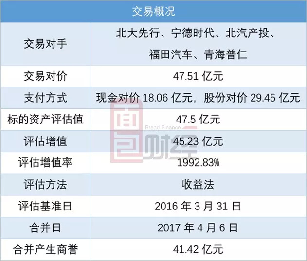 2017年,东方精工以发行股份及支付现金的方式购买北大先行、宁德时代、福田汽车、北汽产投、青海普仁合计持有的普莱德100% 股权,交易对价约47.51亿元。主要交易信息如下表所示: