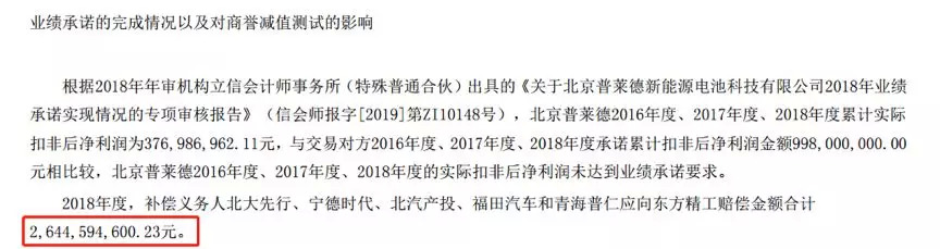 同时,东方精工年报中称:2018年度,补偿义务人北大先行、宁德时代、北汽产投、福田汽车和青海普仁应向东方精工赔偿金额合计约26.45亿元。