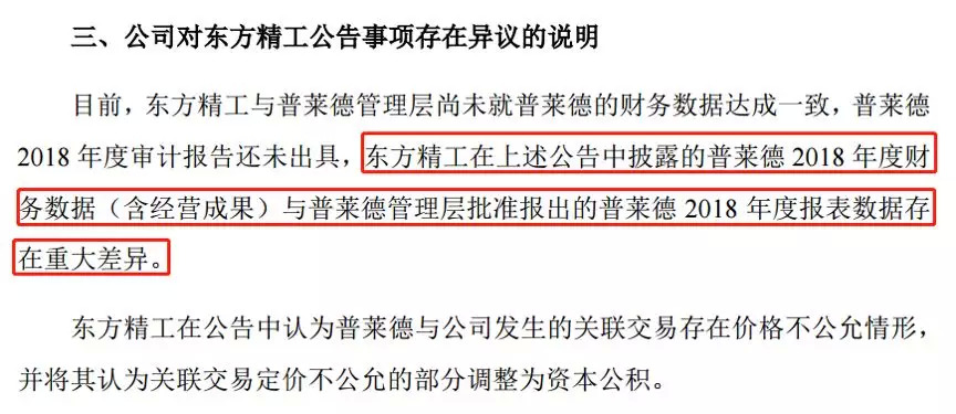 并表示:“目前,东方精工与普莱德管理层尚未就普莱德的财务数据达成一致,普莱德2018年度审计报告还未出具,东方精工在上述公告中披露的普莱德2018年度财务数据(含经营成果)与普莱德管理层批准报出的普莱德2018年度报表数据存在重大差异。”