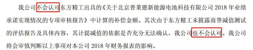 “公司不会认可东方精工出具的《关于北京普莱德新能源电池科技有限公司 2018 年业绩承诺实现情况的专项审核报告》中计算的补偿金额。其次由于东方精工未披露商誉减值测试的评估报告及具体内容,其计提减值的依据是否充分无法确认,我公司也不会认可。我公司将会审慎判断以上事项对本公司2018年财务报表的影响。”