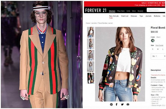 在时尚行业,抄袭早不是一个新鲜话题,既有商业品牌涉嫌抄袭设计师品牌、奢侈品牌,也有奢侈品牌疑似抄袭年轻设计师品牌。一些比较出名的案例包括,Gucci起诉Forever 21侵权使用其标志性红绿及红蓝条纹元素;Diesel母公司OTB起诉Zara母公司Inditex,称Zara的相关商品抄袭Diesel牛仔裤以及Marni凉鞋,等等。