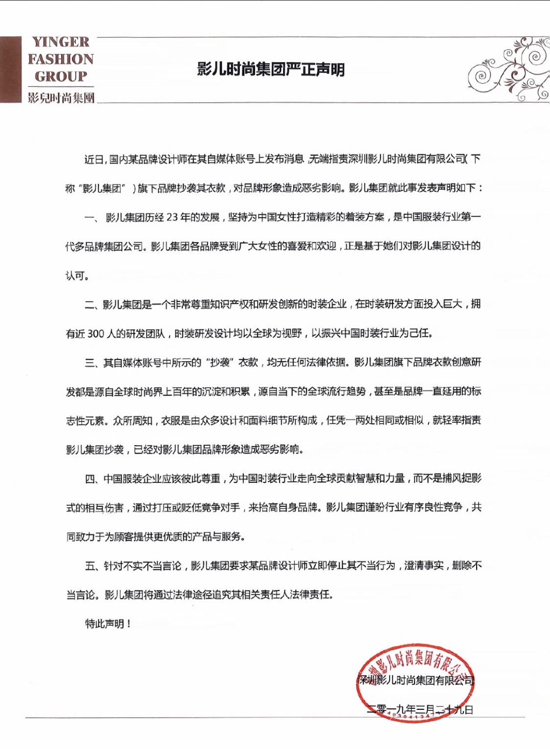 影儿时尚对此回应表示,作为成立已有23年的中国服装行业第一代多品牌集团公司,其一直非常尊重知识产权和研发创新的时装企业,目前的研发团队人员已达300名,并强调,网络上关于其抄袭均的指控均无法律依据,对品牌形象造成恶劣影响,要求相关人士澄清事实,删除言论,并将通过法律途径追究相关责任人的法律责任。