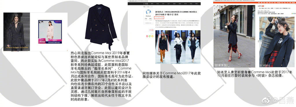 吕燕个人品牌COMME MOI的多款设计也在这两天被指涉嫌抄袭多个国际知名设计师品牌。4月28日,吕燕又通过微博发出多项“证据”,从设计时间点、面料和版型开发过程等角度,澄清其未有抄袭任何大牌,并指是在发布影儿时尚相关内容后,受到了“网络水军”的诬陷。