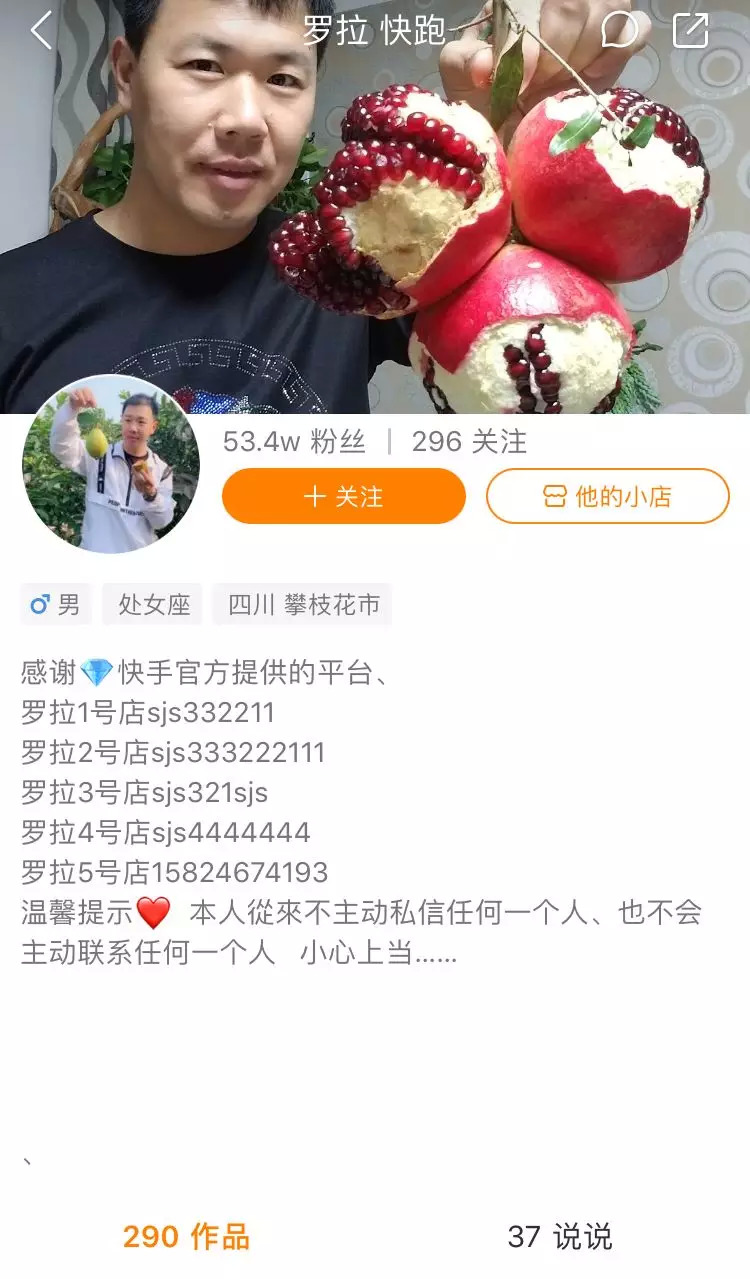 快手名为“罗拉快跑”的申俊山开通了快手小店,也没有放弃自己的其他渠道