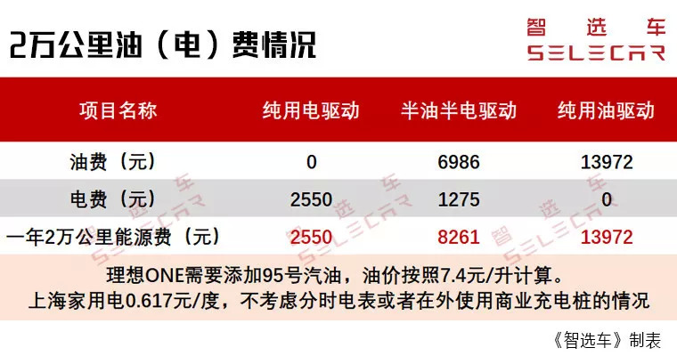 另外理想ONE的1.2T增程器需要使用95#汽油,目前上海95#汽油价格为7.4元/L。上海的民用电价为0.617元/度,如果安装了分时电表,谷时的电价仅为0.307元/度,如果是在外面使用快充充电桩,可能会达到1.8元/度。本文中统一采用0.617元/度作为电价的计算标准。最终可以看出,在一年2万公里的情况下,理想ONE的油(电)总花费根据使用情况的不同从2550元到13972元不等。