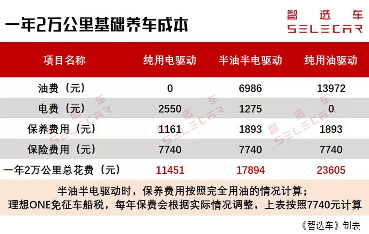 最终在一年2万公里的条件下,根据油电使用情况的不同,理想ONE的基础养车成本从11451元到23605元不等。当然,像是轮胎、刹车片、雨刮等易损件的更换,以及停车费、过路费等不确定费用都未计算在内。通过计算结果可以看出,如果可以增加理想ONE纯电行驶的比例,它的基础养车成本比较有优势。