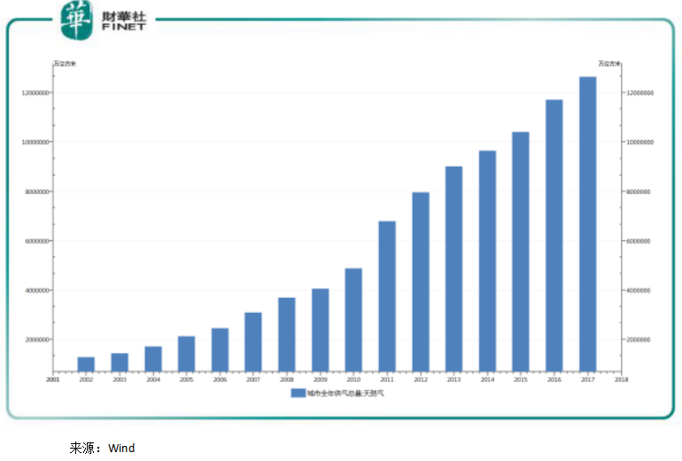2.中国内地燃气市场高速增长。下图是中国内地城市2001年-2017年全年天然气供气总量表,这张表内的柱形走势与上图香港地区的燃气用气总量走势完全不一样,中国内地对天然气的需求十分旺盛。