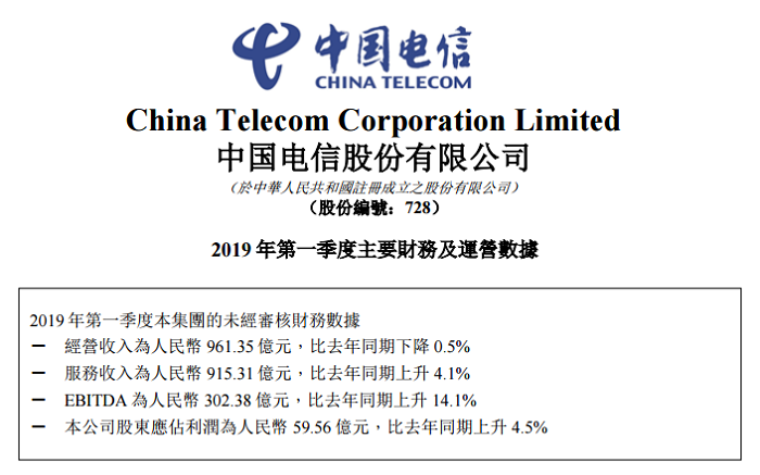 财报显示,2019年第一季度,中国电信实现经营收入为人民币961.35亿元,比去年同期下降0.5%;公司股东应占利润为人民币59.56亿元,比去年同期上升4.5%,EBITDA为人民币302.38亿元,比去年同期上升14.1%。