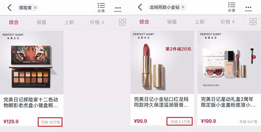 去年双十一,完美日记与大英博物馆合作推出的联名款眼影盘,在天猫预售中创出每11.5秒卖出一盘的成绩,数小时内10万盘售罄。今年3月,完美日记又与Discovery探索频道联名推出了“探险家十二色眼影”系列。如今,完美日记天猫旗舰店上,该系列月销18万笔。