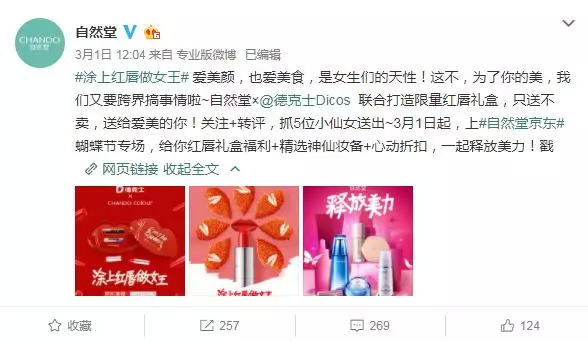 譬如,3月1日,自然堂与德克士Dicos联合推出了限量红唇礼盒。令人惊讶的是,该款限量红唇礼盒只送不卖。