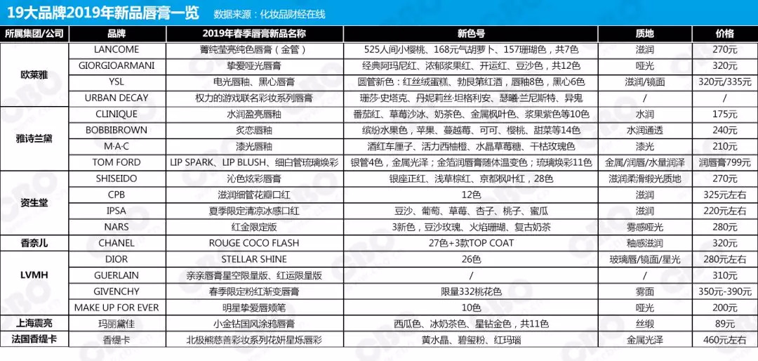 口红作为自带高时尚度和高替代性的品类,产品创新是品牌保持活力的最大动力之一,为了进一步看清当下口红市场的竞争格局,我们搜集总结了19大品牌在今年春季新推的口红单品,在色号、膏体、包材和营销方式上,我们发现了这几大新趋势。