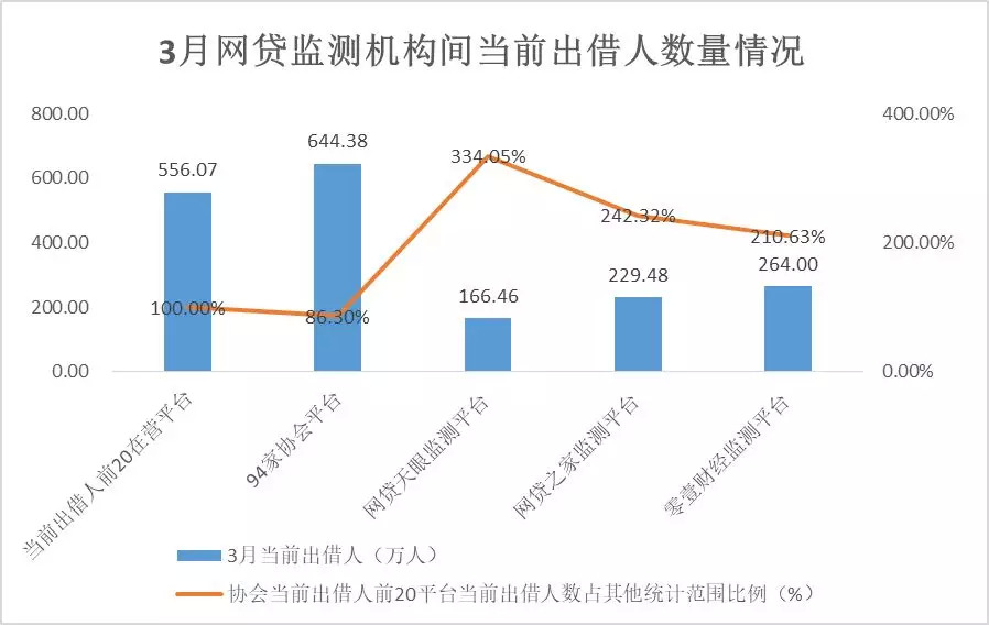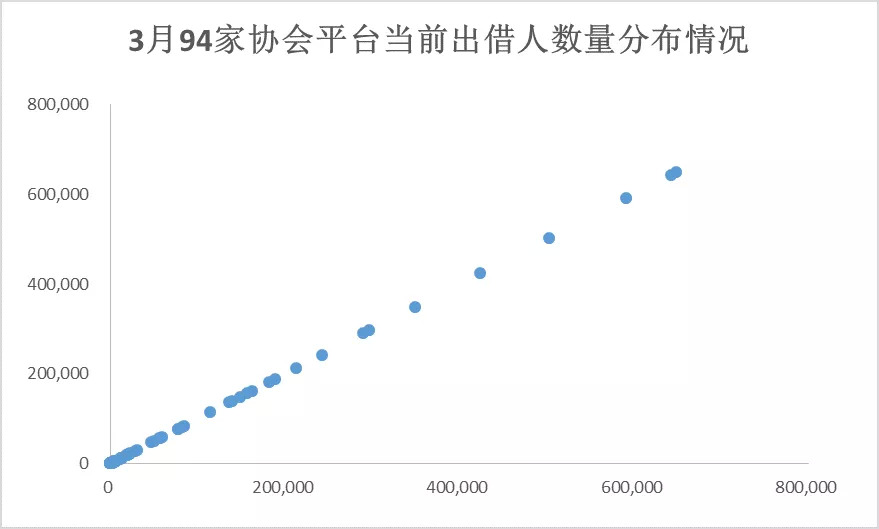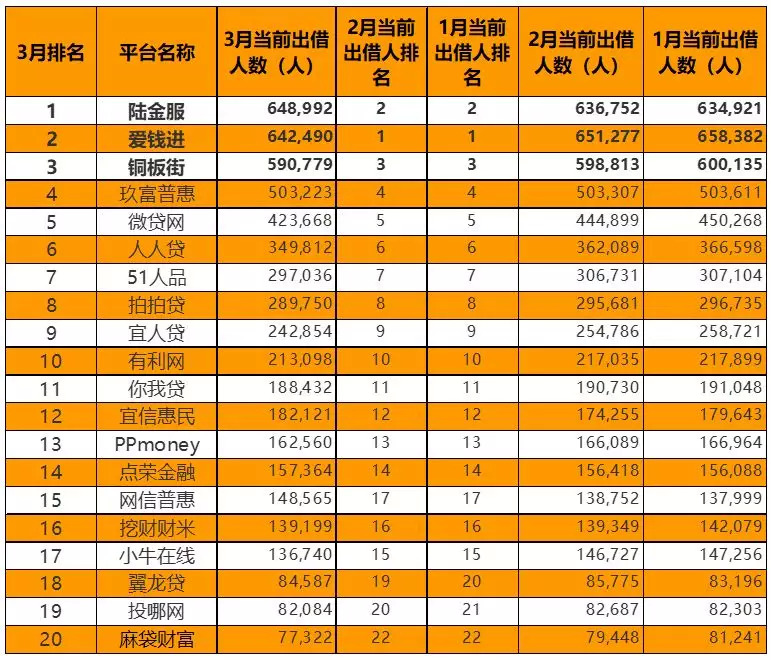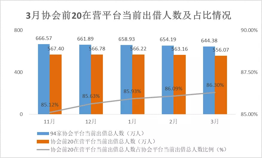 这20家在营平台3月服务的出借总人数占全部94家平台的86.3%,占比高于2月的86.09%和1月的85.93%。