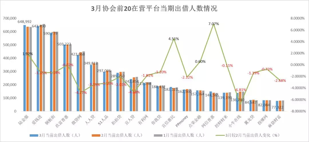 94家协会平台中,在营且当前出借人数最高的20家平台仍在服务556.07万出借人,较2月的563.16万下降1.26%,降幅同样高于2月的0.54%和1月的0.1%。