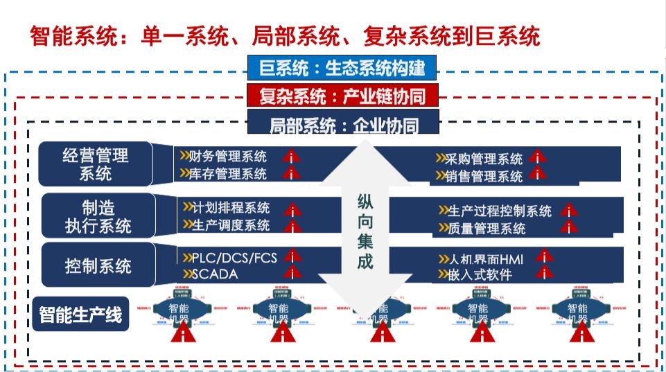 德国工业4.0讲横向集成、纵向集成、端到端集成,从这个角度来讲,什么是集成?集成是数据的互联网互操作,集成的本质就是对制造资源优化范围、领域深度的描述,从自动化到智能化,就是从局部优化到全局优化的过程,在时间上优化只有起点没有终点,空间上参与优化的资源从点、线、面、大系统、巨系统的方向不断地扩展。如果说,自动化是单点的、低水平的,有限的资源优化;那么,智能化是多点、高水平、全局的资源优化。所谓集成的过程,就是对制造过程的范围领域不断地深化的过程。